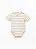 This body is made of organic cotton jersey, in Dark Green. It features a round neckline, short sleeves, chest pocket, shoulder opening with coconut buttons, snap fasteners between the legs made of nickel-free metal, and striped pattern. This piece was designed for change and growth, allowing it to remain with the same child for longer. Use the snap adjustment system to increase the height of the body.
