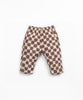 These trousers are made from cotton corduroy and recycled cotton, in the Cru color. They feature an elastic waistband, a decorative coconut button, and our tile print.
