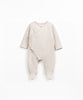 This jumpsuit is made of jersey with a mixture of regenerative cotton and recycled cotton, in Off White color. It features brushed interior, long sleeves, and integrated feet. It has a wrap opening with an exterior tie and interior snap, as well as an opening between the legs with nickel-free metal snaps.