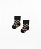 These jacquard socks are made of organic cotton knit, in Dark Grey color. Model with tile pattern.