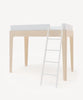 The elevated sleep space creates room below for a reading nook, a study area, or a play zone, while the safety-treaded ladder can be attached on either side.