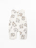 This jumpsuit is made of linen, in the color Cru. It is a sleeveless model with a round neckline, front opening with coconut buttons, crotch opening with nickel-free metal snaps (crotch opening up to size 18M), side pocket appliqués and our crab print.