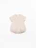 This jumpsuit is made from jersey with a blend of cotton and recycled cotton, in the Cru colour. It includes the Re(Play) yarn derived from recycling our post-industrial waste. It is a short-sleeved model with a round neckline and a balloon shape. It features a back opening with coconut buttons and a nickel-free metal snap-button opening between the legs.