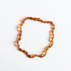 The string on each of our necklaces and bracelets is knotted by hand in between each and every bead, so should the necklace break (which it should if necessary), the rest of the beads will not scatter. The jewelry fastens with a classic screw clasp that opens and closes easily. The pieces are beautifully made, comfortable, lightweight, and radiate energies of peace and calm for the wearer. Amber jewelry is made for wearing not for chewing.