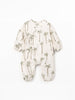 This jumpsuit is made from organic cotton fabric in the color Raw. It has long sleeves, a front wrap opening with an outer tie and a nickel-free metal snap on the inside, and an opening between the legs with nickel-free metal snaps and our palm tree print.